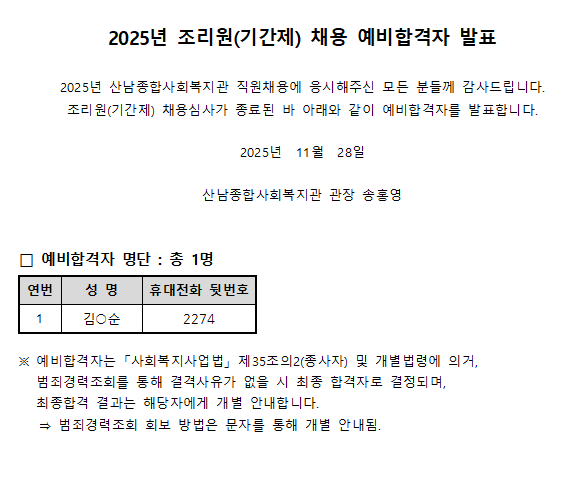 [예비합격자 발표] 조리원(기간제) 채용 예비합격자 발표