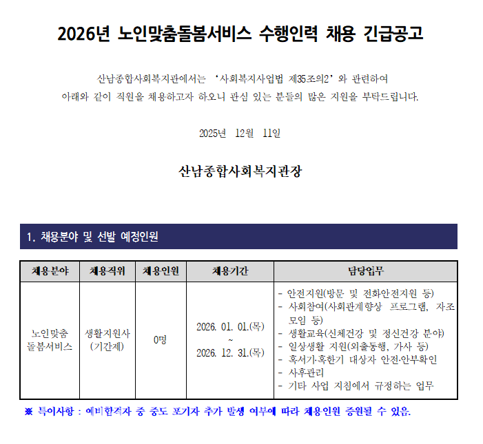 [직원채용 긴급공고] 2026년 노인맞춤돌봄서비스 수행인력 채용 긴급공고(생활지원사)