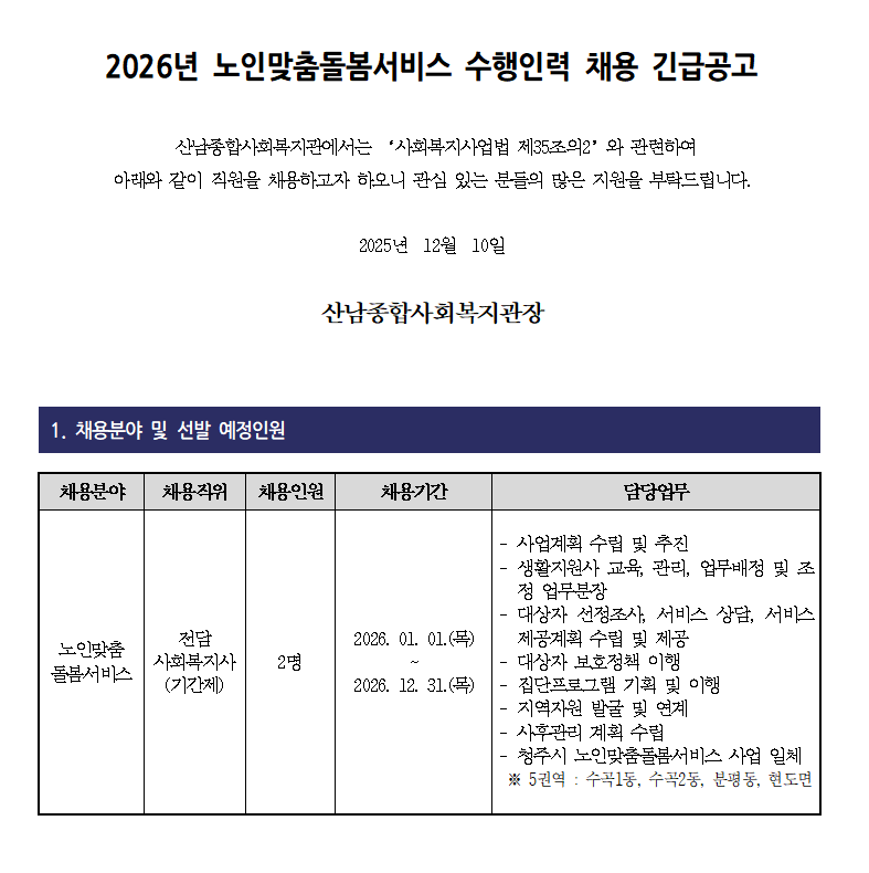 [직원채용 긴급공고] 2026년 노인맞춤돌봄서비스 수행인력 채용 긴급공고(전담사회복지사)
