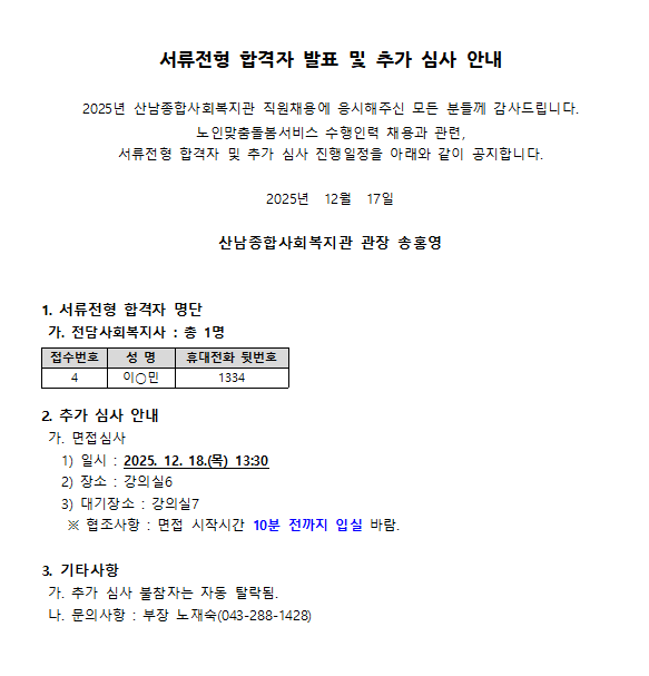 [서류합격공고] 2026년 노인맞춤돌봄서비스 수행인력 채용 긴급공고(전담사회복지사)