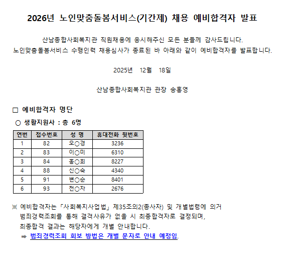 [예비합격자 발표] 2026년 노인맞춤돌봄서비스(기간제) 채용 예비합격자 발표(긴급_생활지원사)