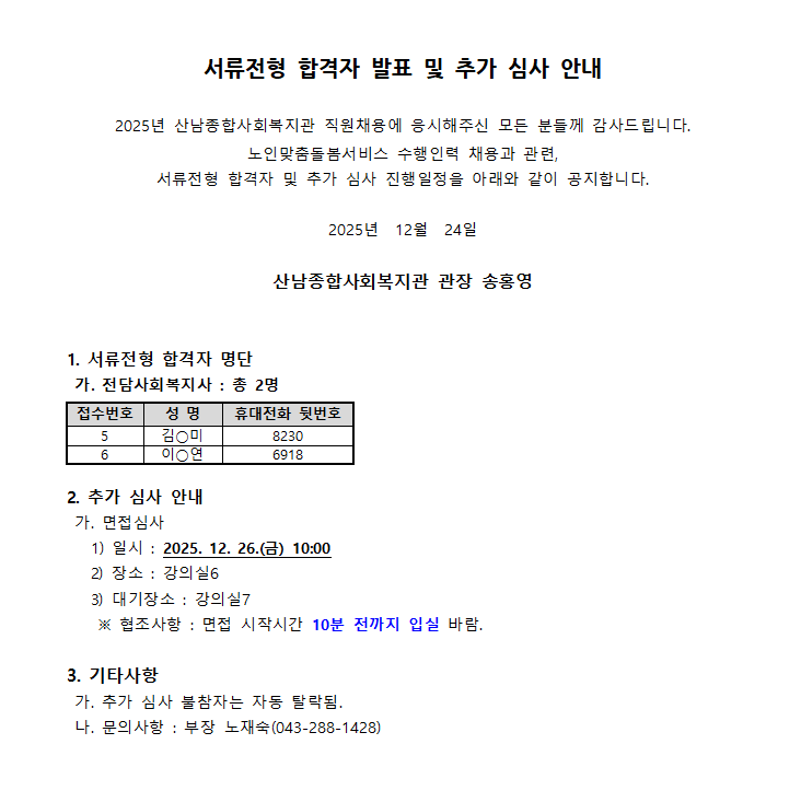 [서류합격공고] 2026년 노인맞춤돌봄서비스 수행인력 채용 2차 긴급공고(전담사회복지사)